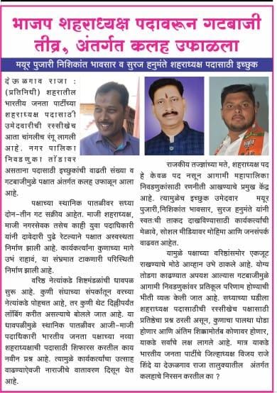साप्ताहिक मातृतीर्थ एक्सप्रेस मध्ये भाजपाच्या शहराध्यक्ष पदासाठी च्या इच्छुकांची नावे व अंतर्गत कलह बाबत बातमी छापताच भाजपाने तात्काळ दखल घेऊन शहराध्यक्ष पदासाठी निशिकांत भावसार यांची निवड करण्यात आली…